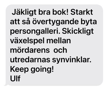 "Nu har jag läst din nya bok och den var superbra och spännande från början till slutet! Mitt i allt blod och spänning fick du in en fin gullig parantes med din lilla familj. Verkligen superbra bok och ser framemot din nästa."
