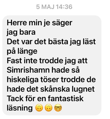 "Har läst dina böcker och blev väldigt förtjust i ditt sätt att skriva. Jag bara älskar Blodsdåd i Simrishamn."